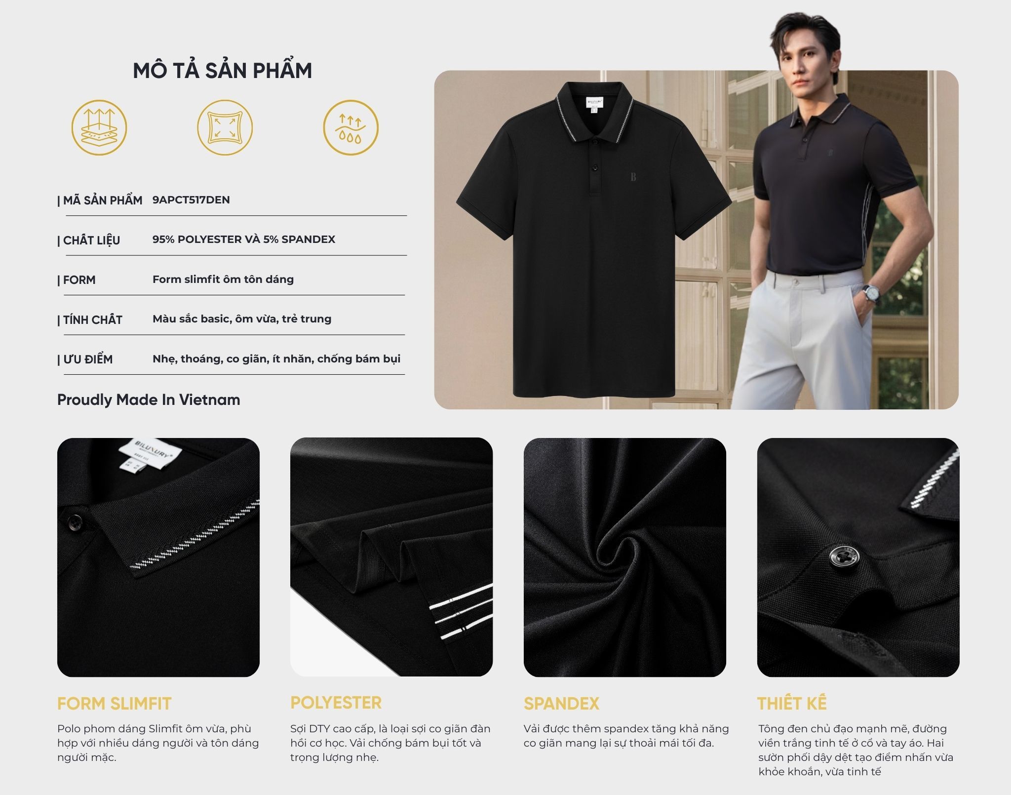 Áo Polo Đen Cao Cấp, Chống Nhăn, Bền Màu 9APCT517DEN