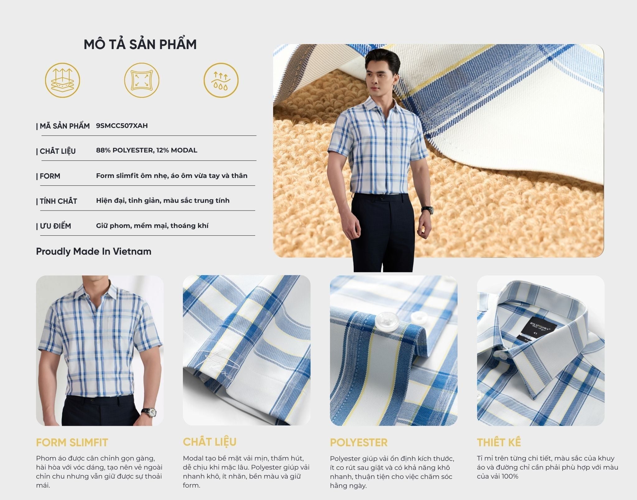 Áo Sơ Mi Cộc Tay Phối Kẻ Caro Cao Cấp, Chống Nhăn, Bền Màu 9SMCC507XAH
