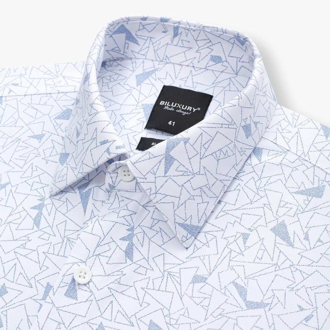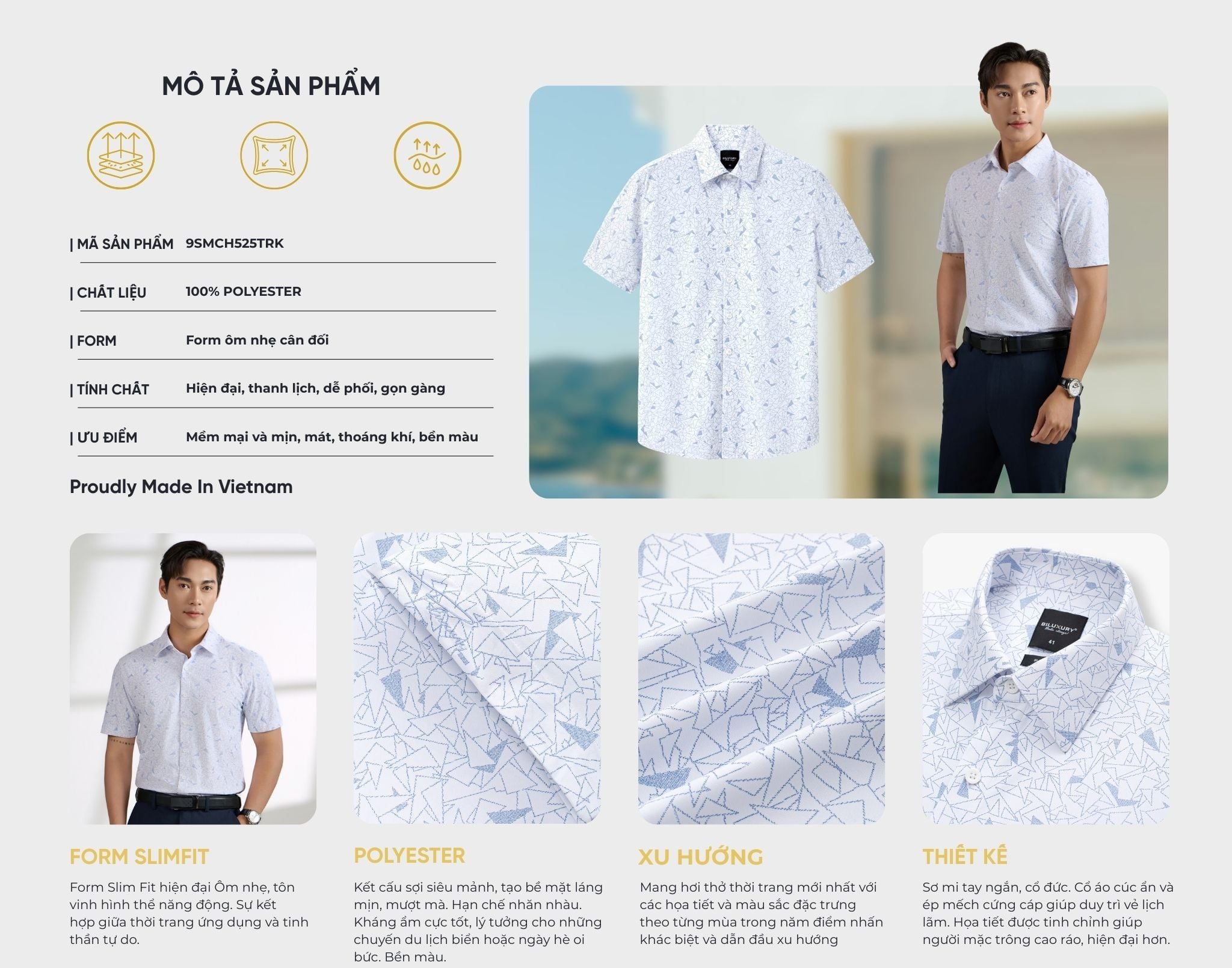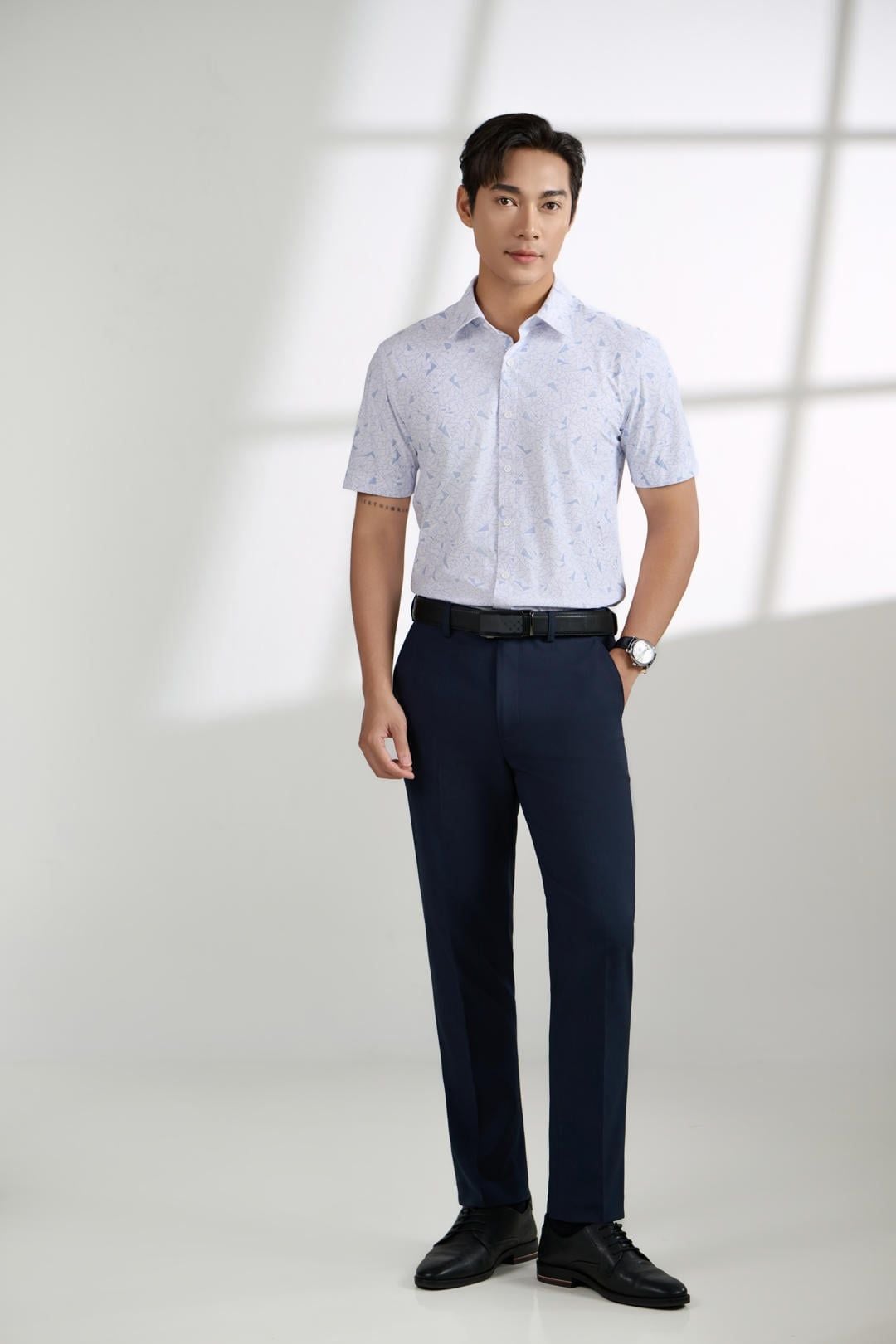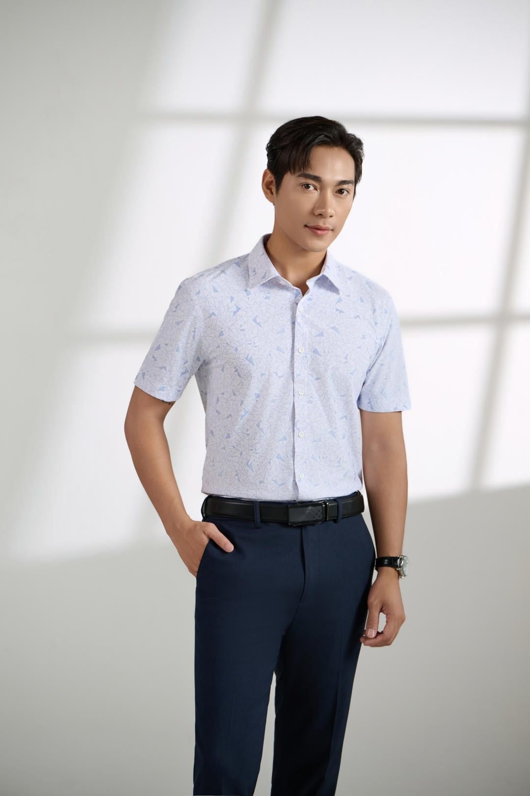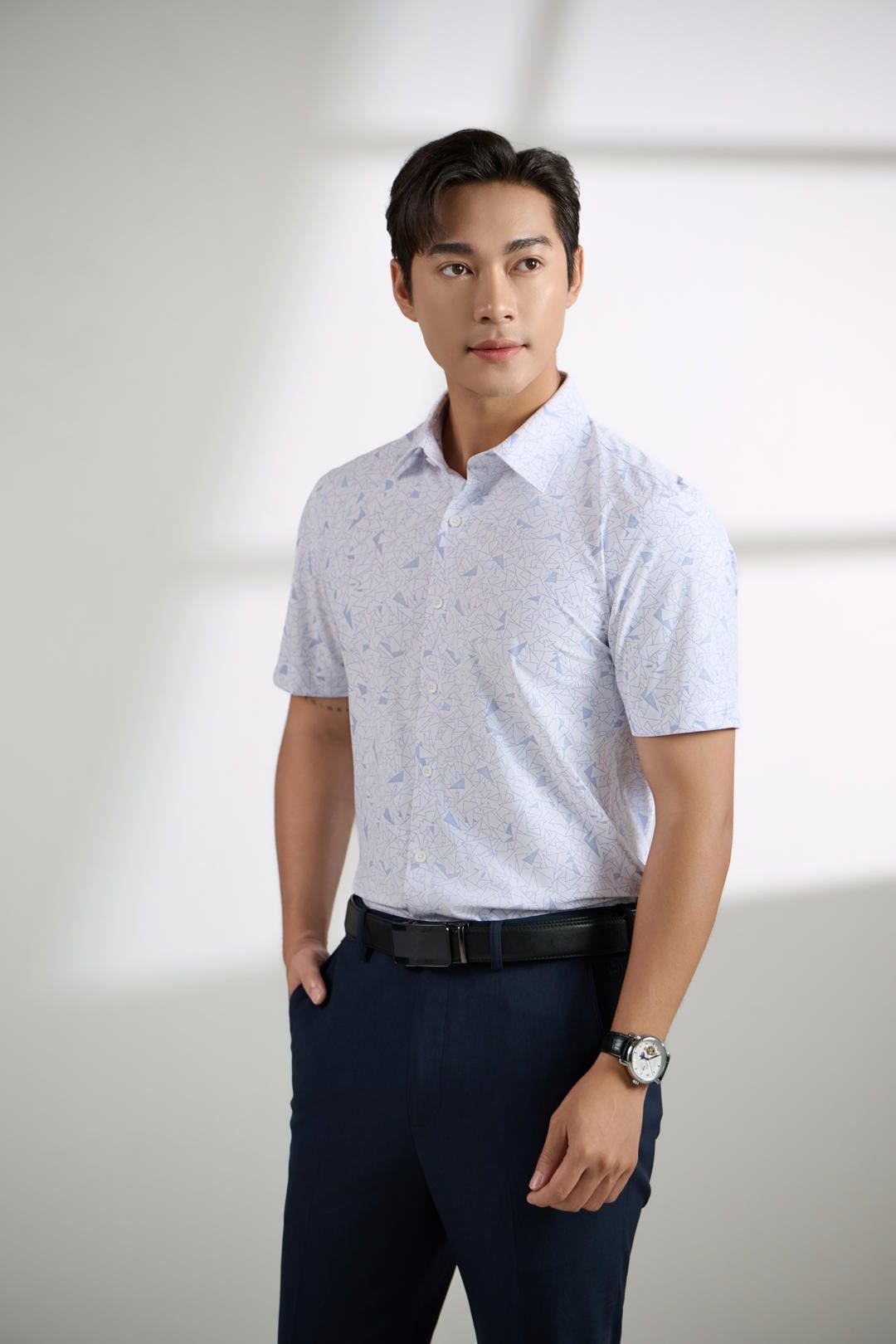 Thiết kế: Sơ mi tay ngắn, cổ đức. Cổ áo cúc ẩn và ép mếch cứng cáp giúp duy trì vẻ lịch lãm. Họa tiết được tinh chỉnh giúp người mặc trông cao ráo, hiện đại hơn.