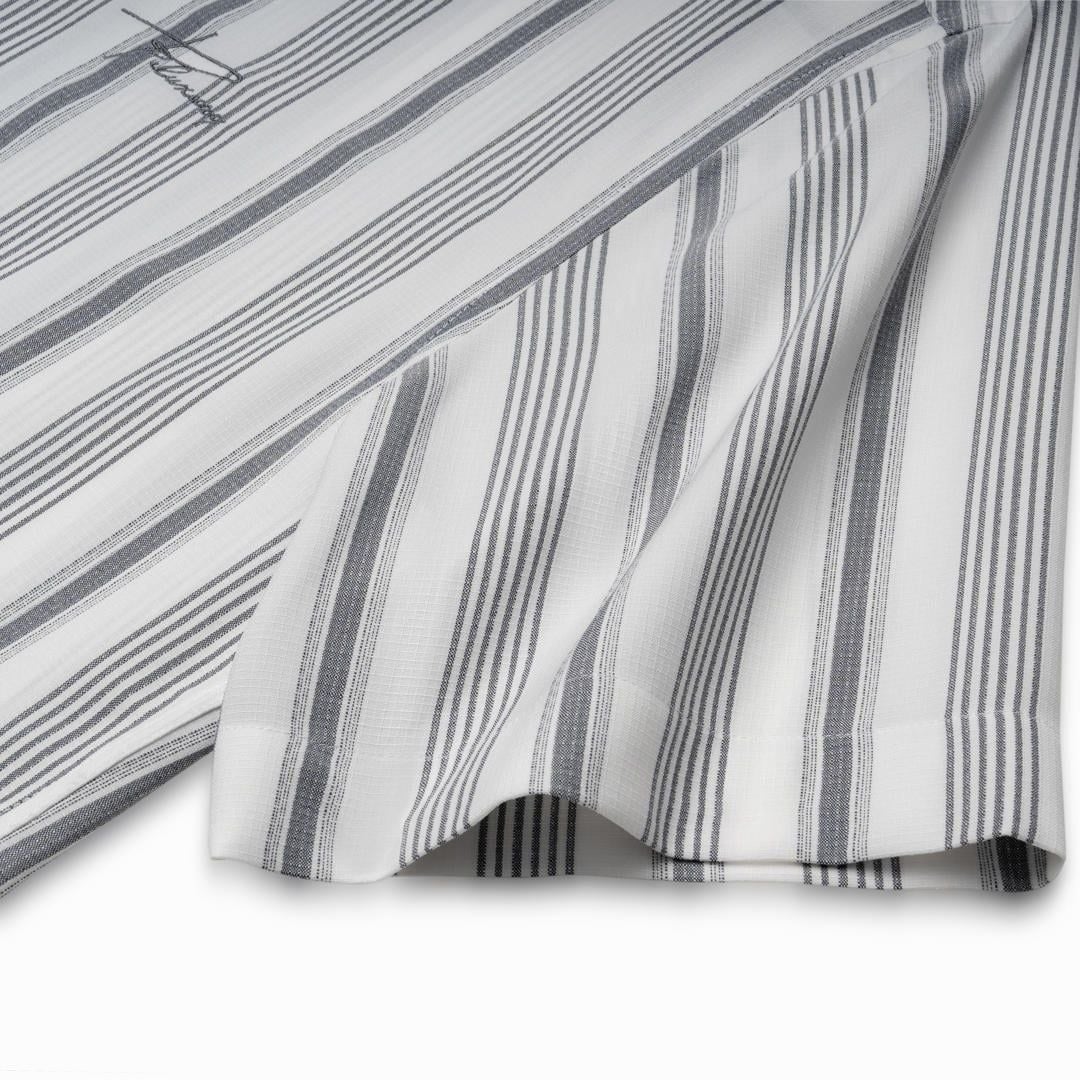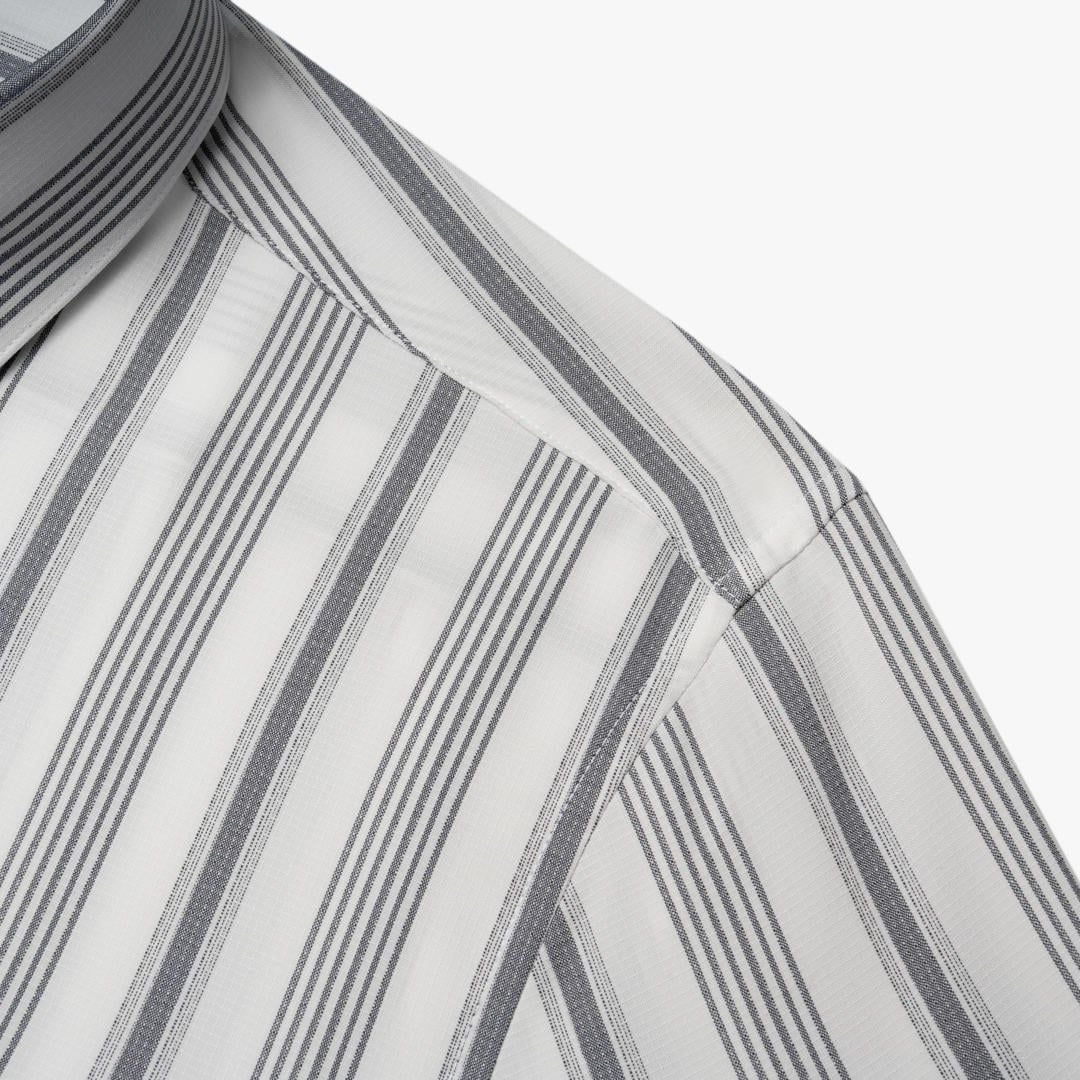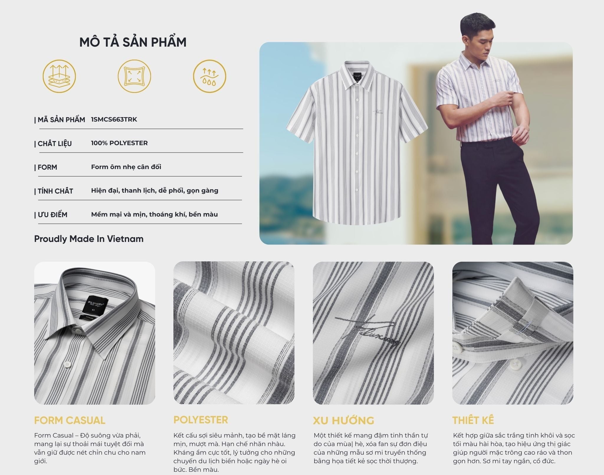 Thiết kế: Kết hợp giữa sắc trắng tinh khôi và sọc tối màu hài hòa, tạo hiệu ứng thị giác giúp người mặc trông cao ráo và thon gọn hơn. Sơ mi tay ngắn, cổ đức.