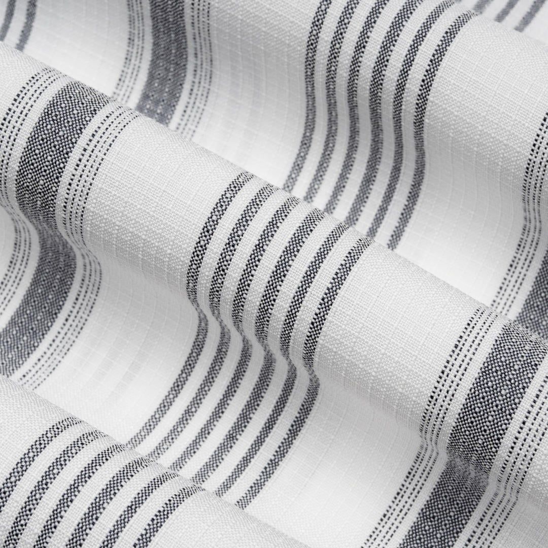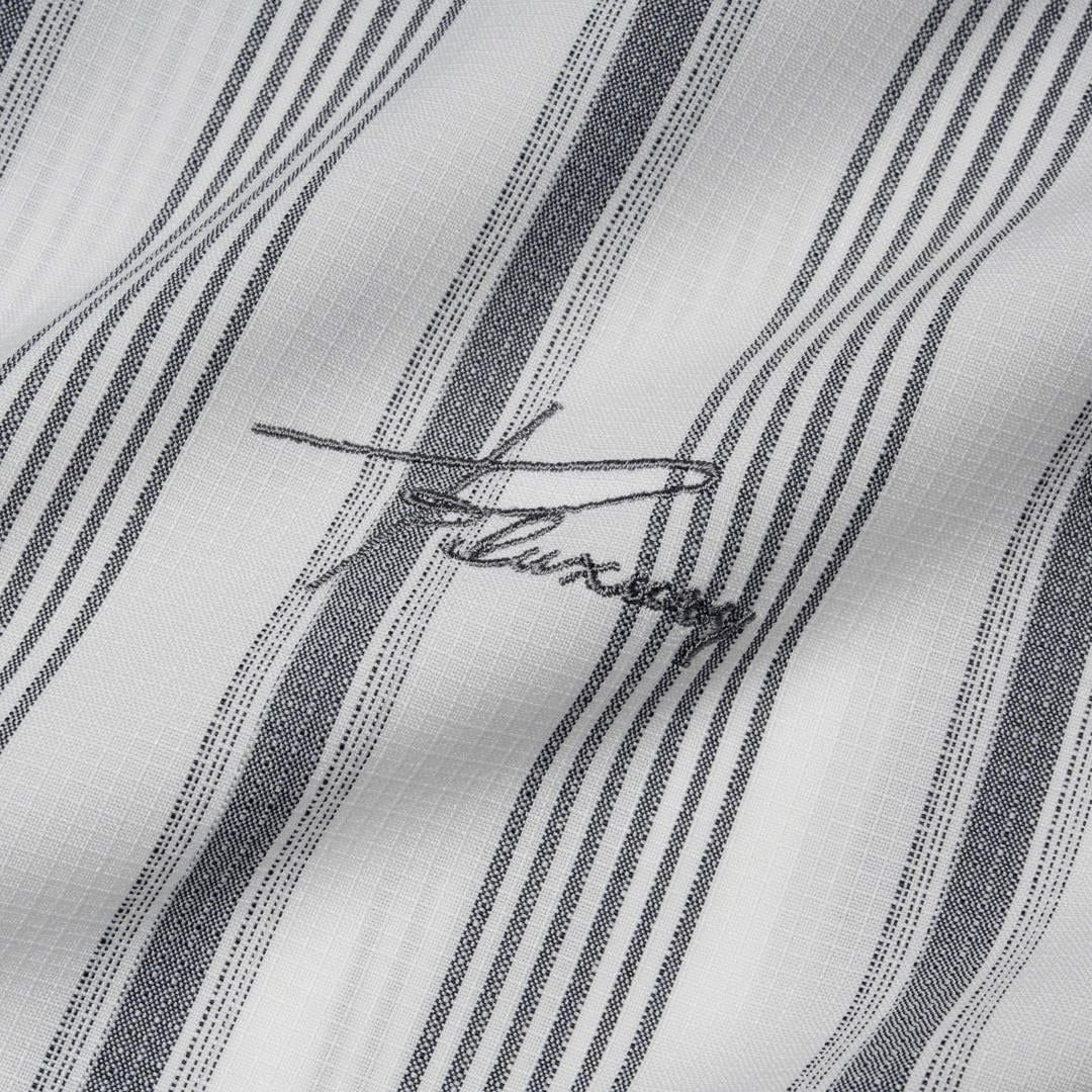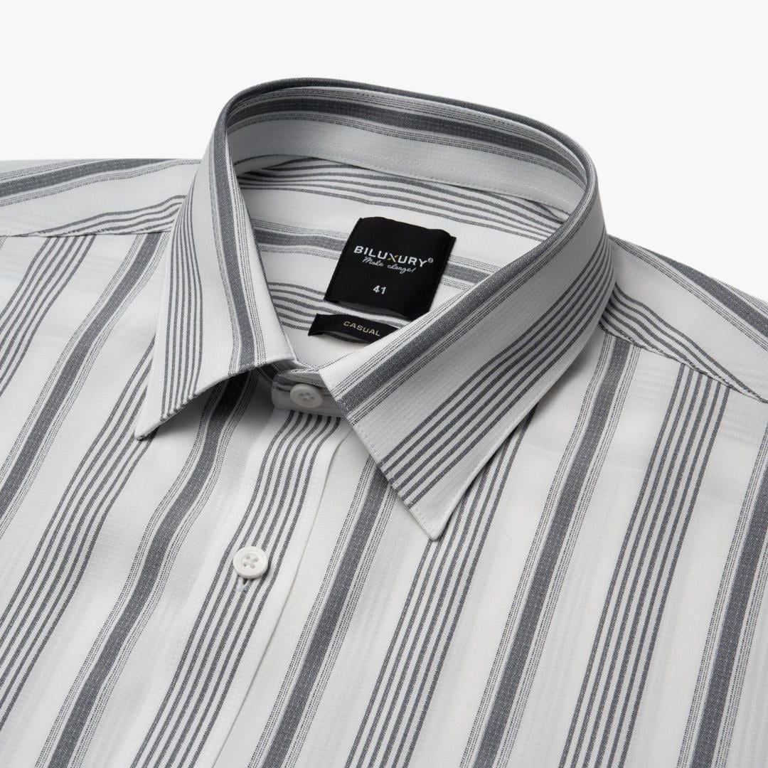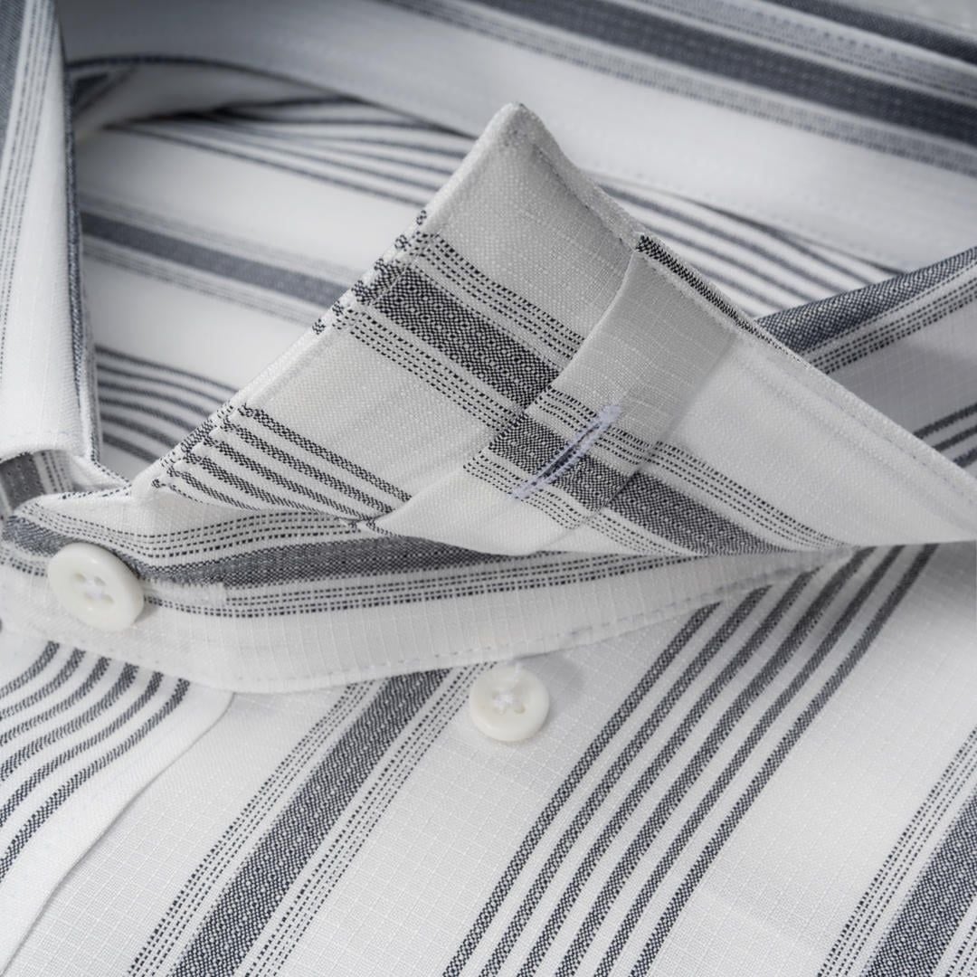 Thiết kế: Kết hợp giữa sắc trắng tinh khôi và sọc tối màu hài hòa, tạo hiệu ứng thị giác giúp người mặc trông cao ráo và thon gọn hơn. Sơ mi tay ngắn, cổ đức.