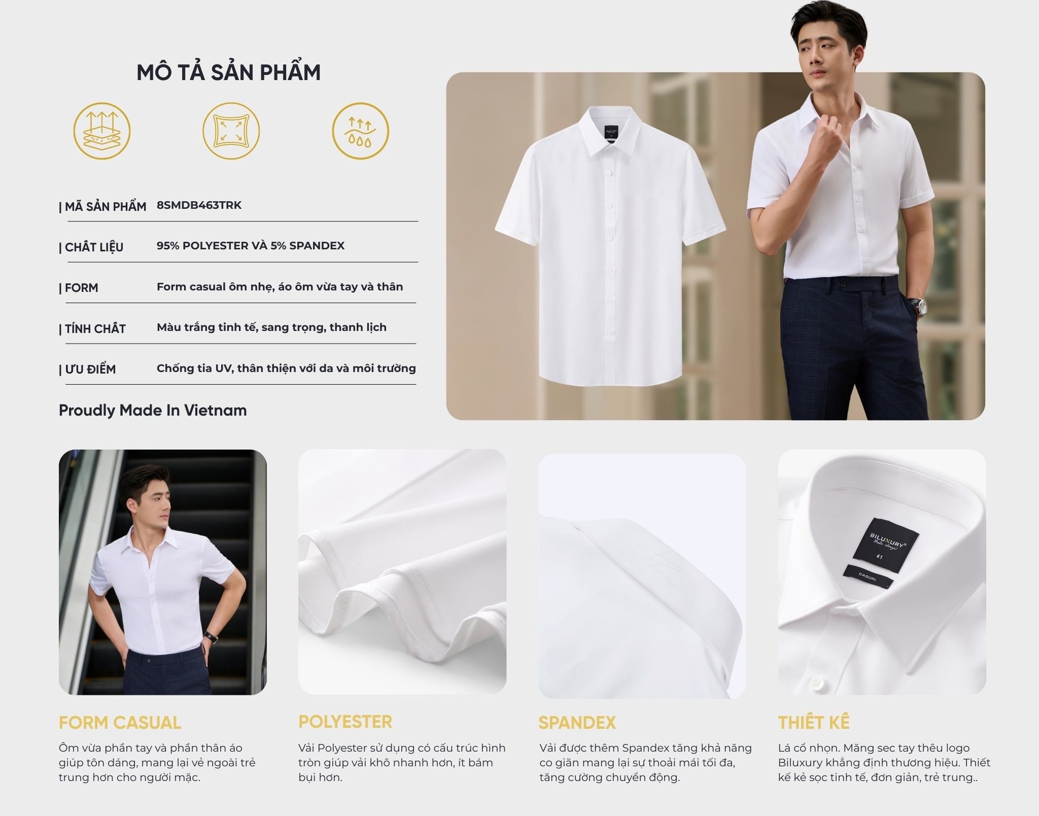 Áo Sơ Mi Cộc Tay Trắng, Cao Cấp, Chống Nhăn 8SMCB412TRK