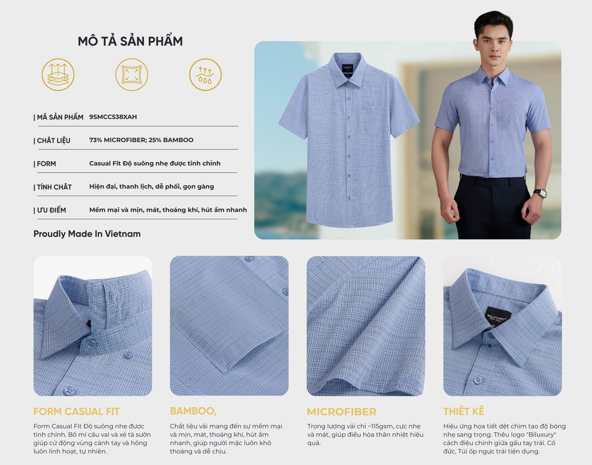 Thiết kế: Hiệu ứng họa tiết dệt chìm tạo độ bóng nhẹ sang trọng. Thêu logo "Biluxury" cách điệu chính giữa gấu tay trái. Cổ đức, Túi ốp ngực trái tiện dụng.