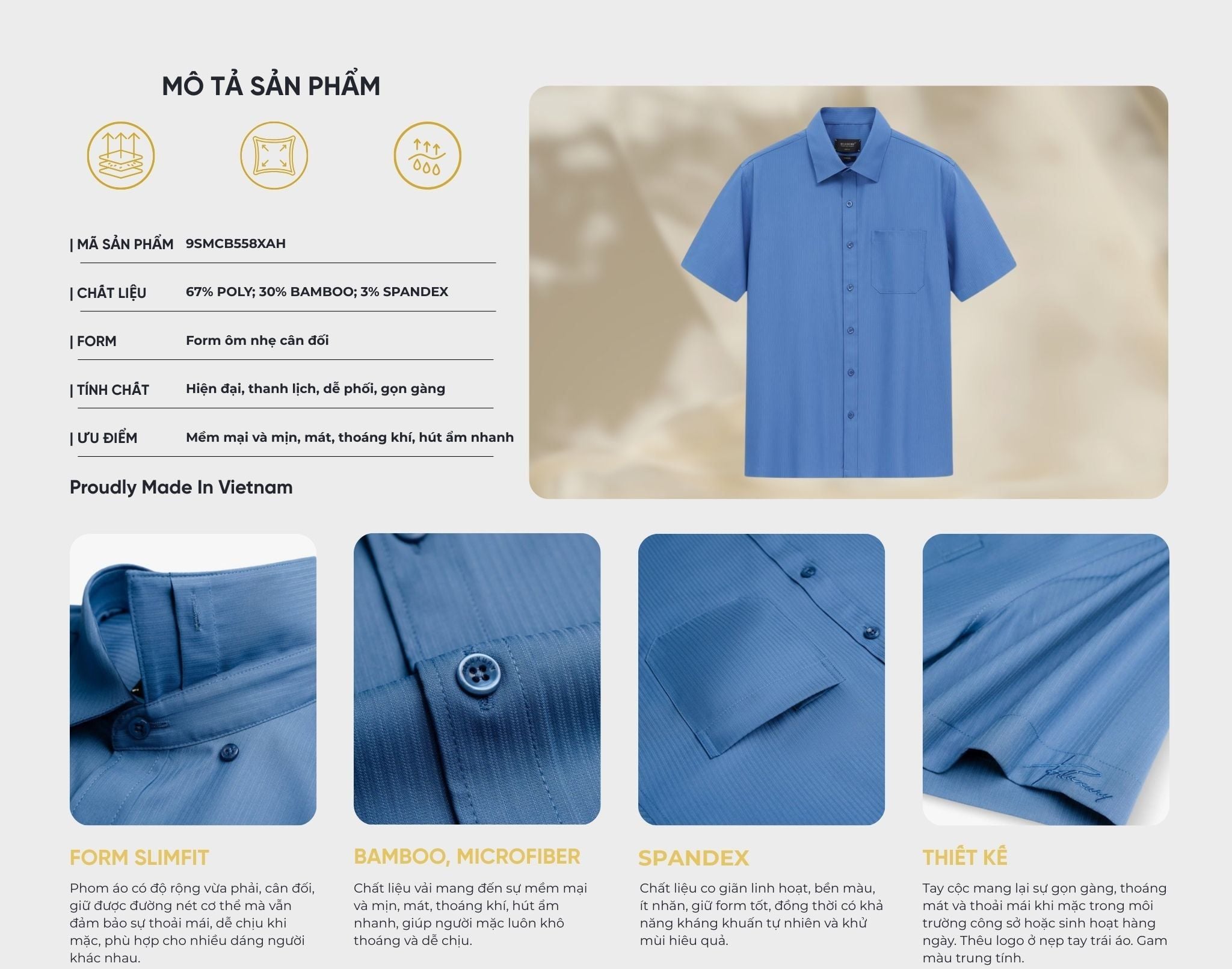 Ưu điểm: Co giãn nhẹ, bền bỉ, giữ form tốt, chống nhăn vượt trội, thoáng khí, thấm hút nhẹ