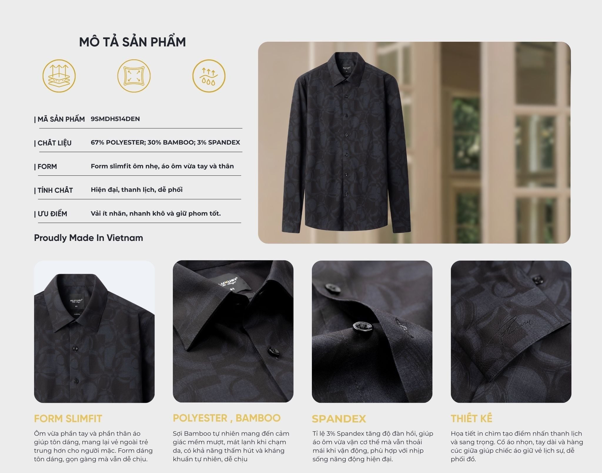 Kiểu dáng: Phom chuẩn, áo đứng dáng ổn định, ôm vừa tay và thân