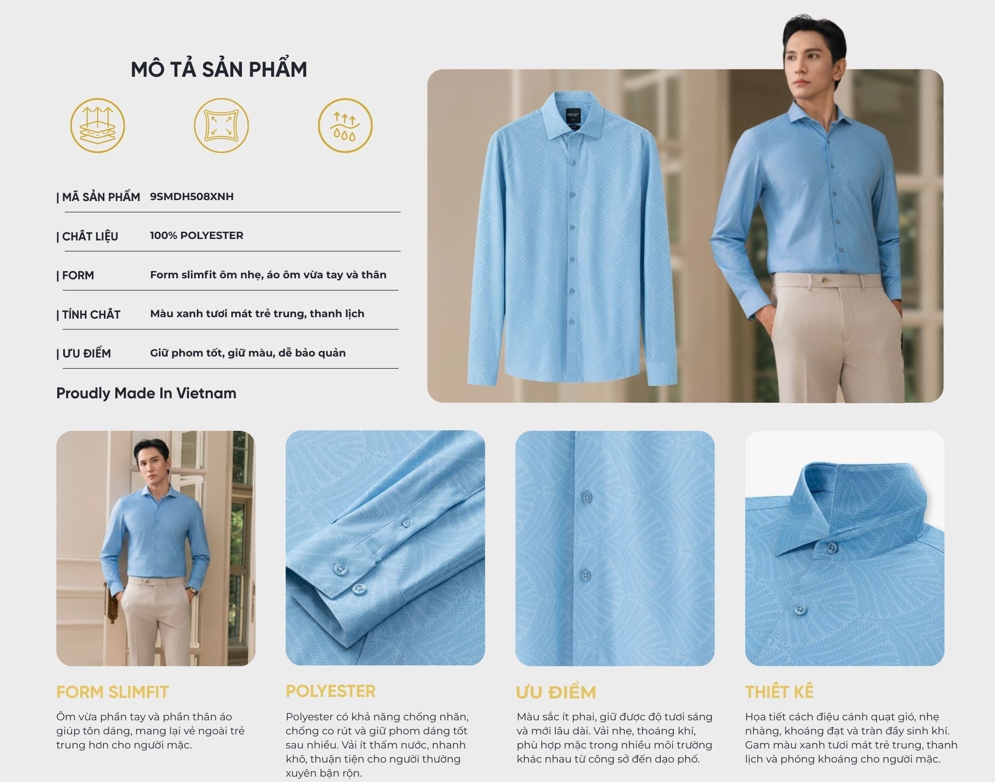 Áo Sơ Mi Dài Tay Phối Hoạ Tiết Cao Cấp, Chống Nhăn Nhàu, Chống Bám Bẩn 9SMDH508XNH
