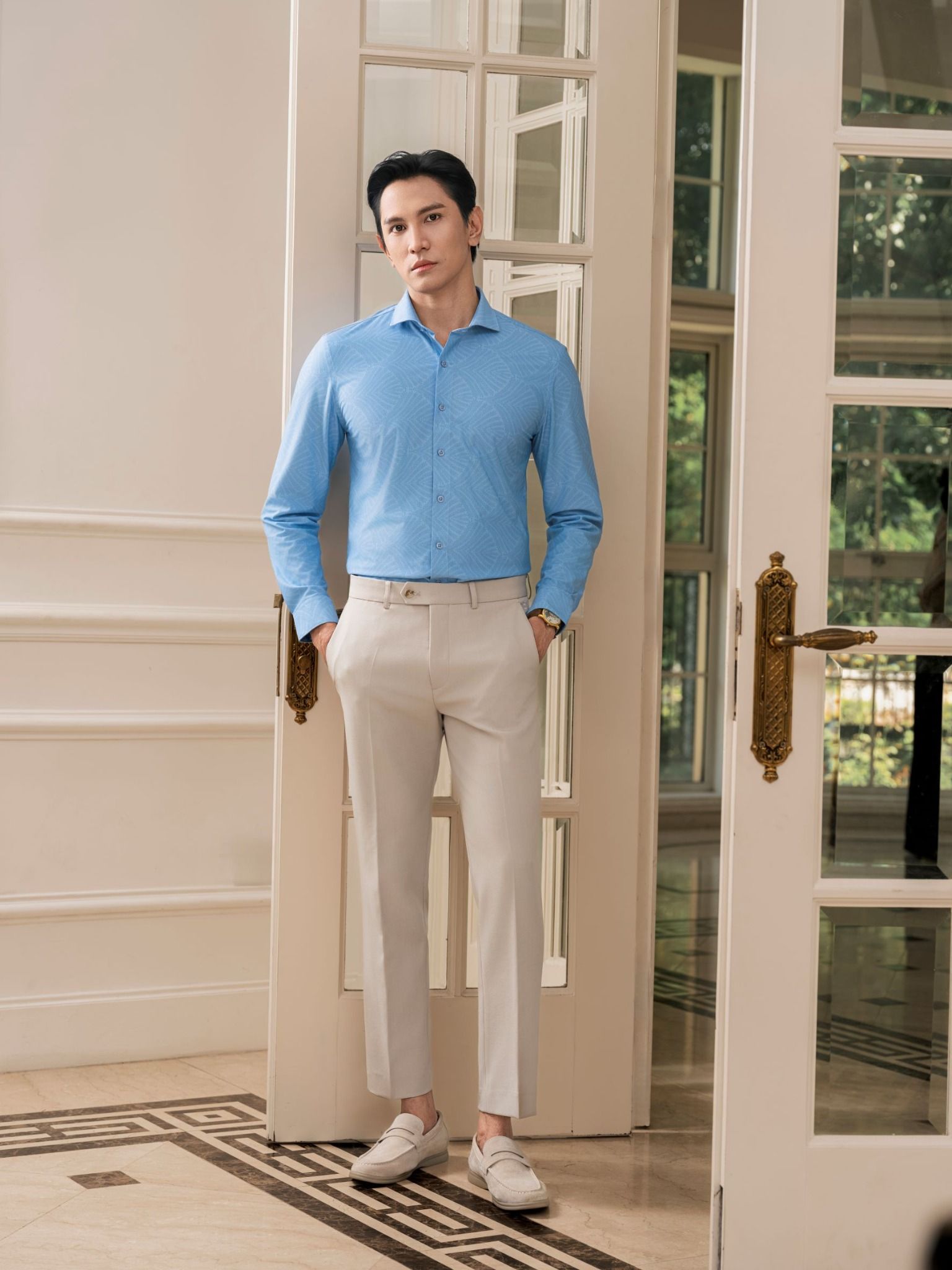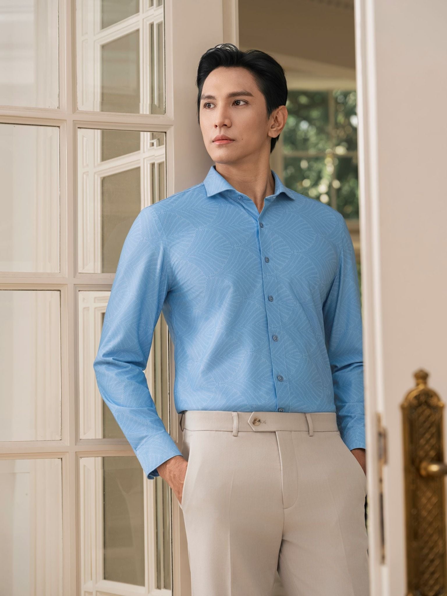Thiết kế: Họa tiết cách điệu cánh quạt gió, nhẹ nhàng, khoáng đạt và tràn đầy sinh khí. Gam màu xanh tươi mát trẻ trung, thanh lịch và phóng khoáng cho người mặc.