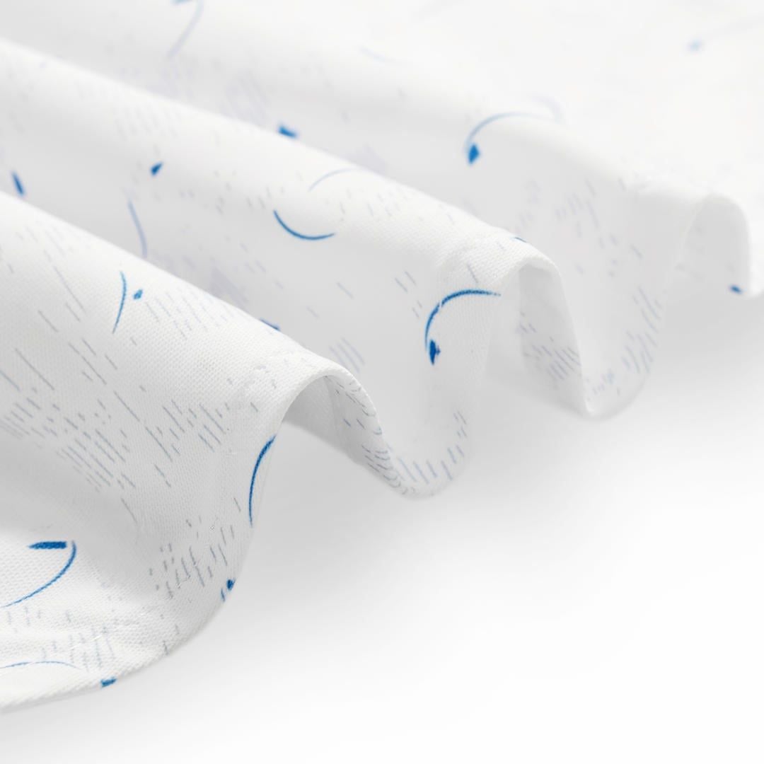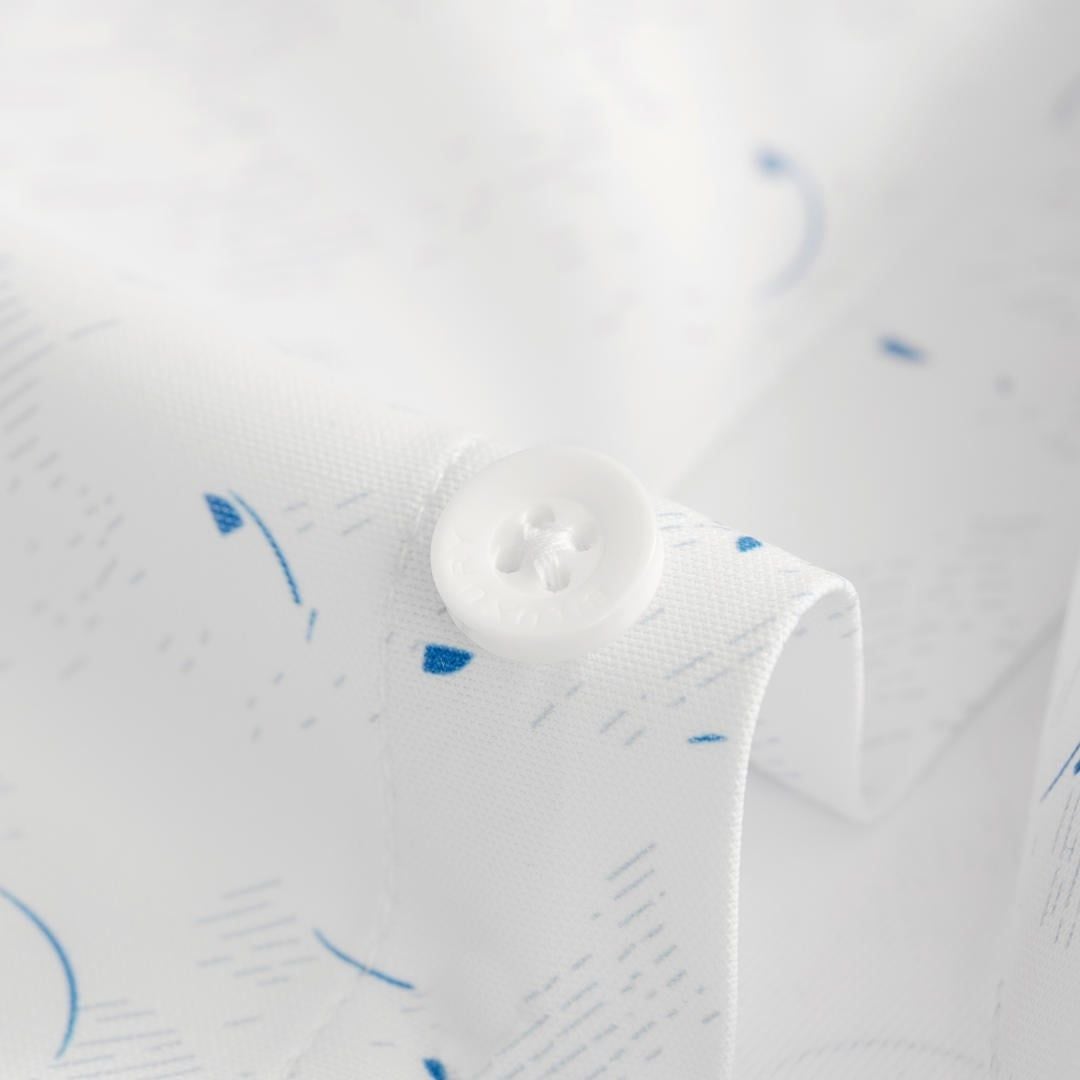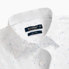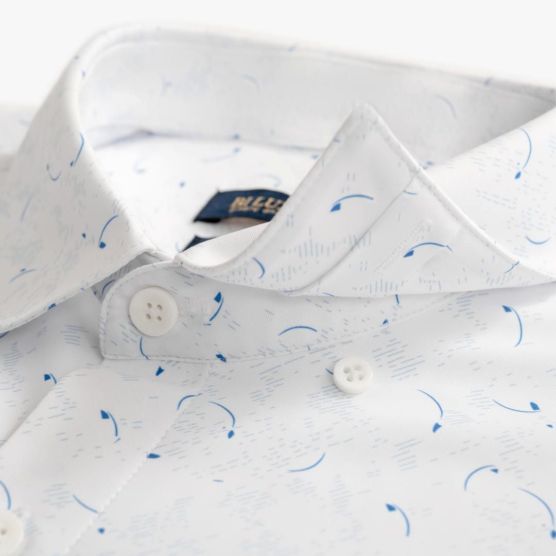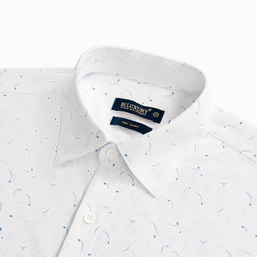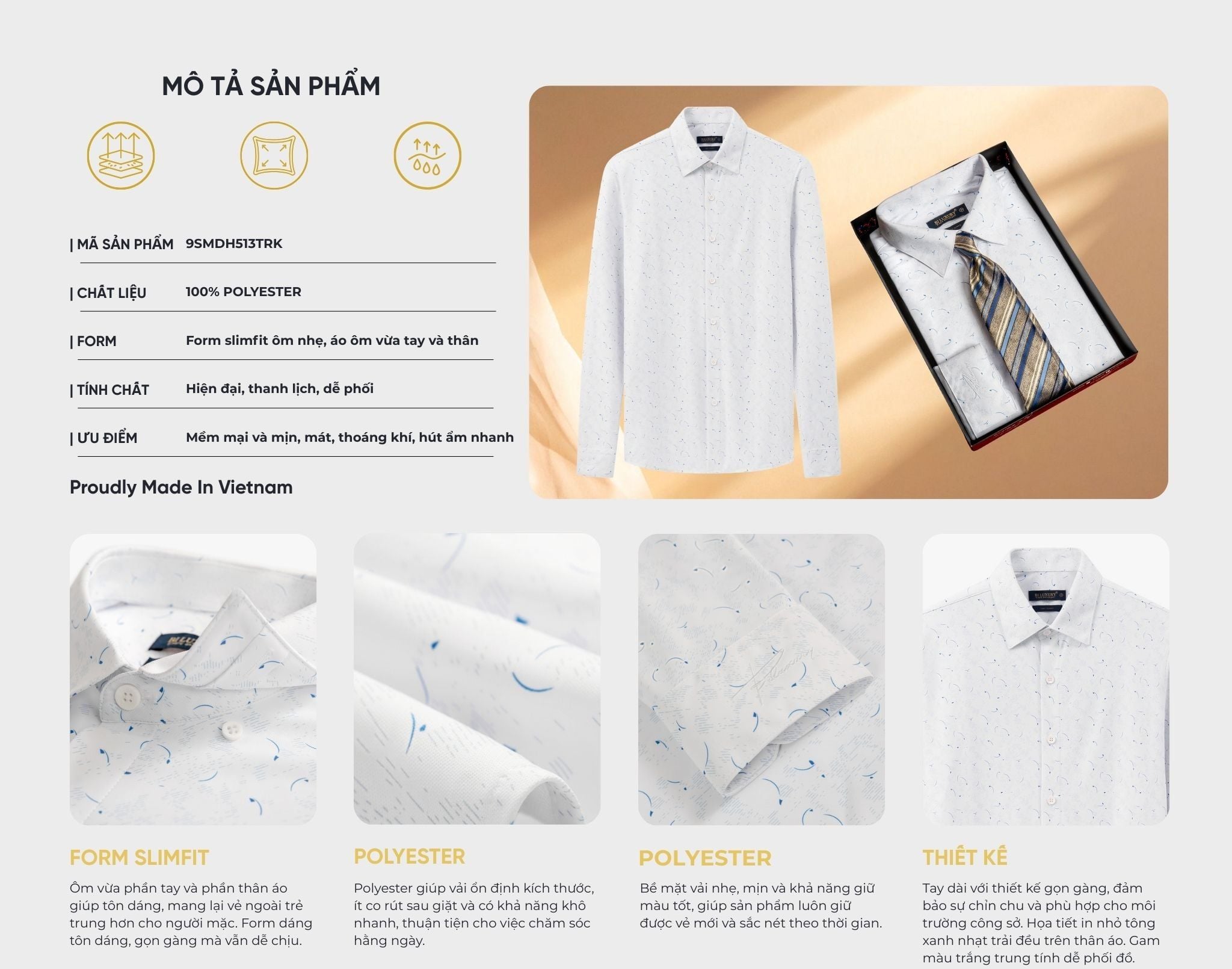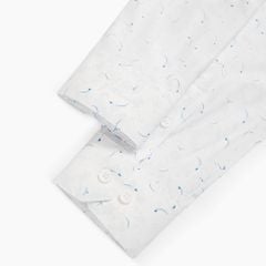 Thiết kế: Tay dài với thiết kế gọn gàng, đảm bảo sự chỉn chu và phù hợp cho môi trường công sở. Họa tiết in nhỏ tông xanh nhạt trải đều trên thân áo. Gam màu trắng trung tính dễ phối đồ.