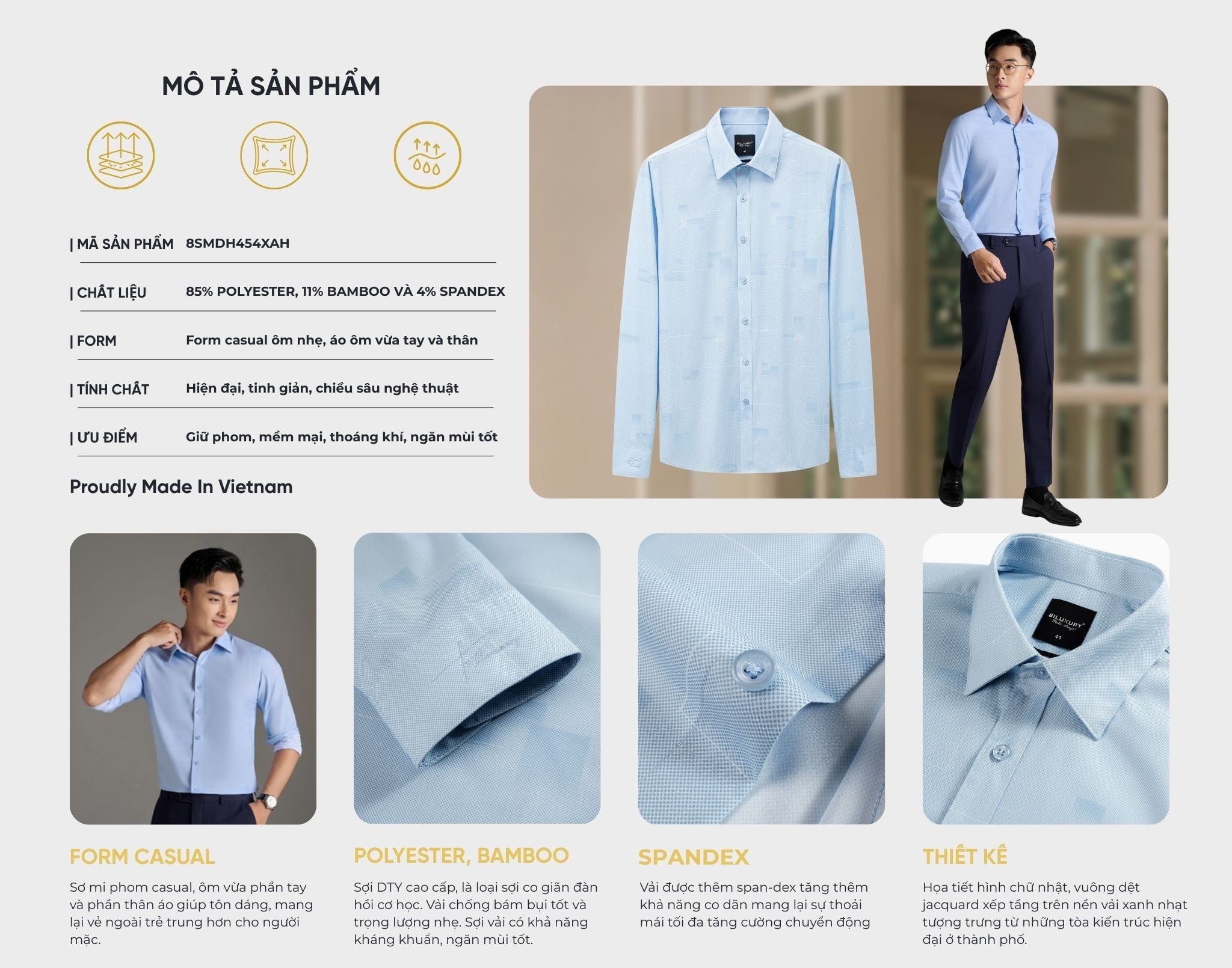 Kiểu dáng: Sơ mi phom casual, ôm vừa phần tay và phần thân áo giúp tôn dáng, mang lại vẻ ngoài trẻ trung hơn cho người mặc.