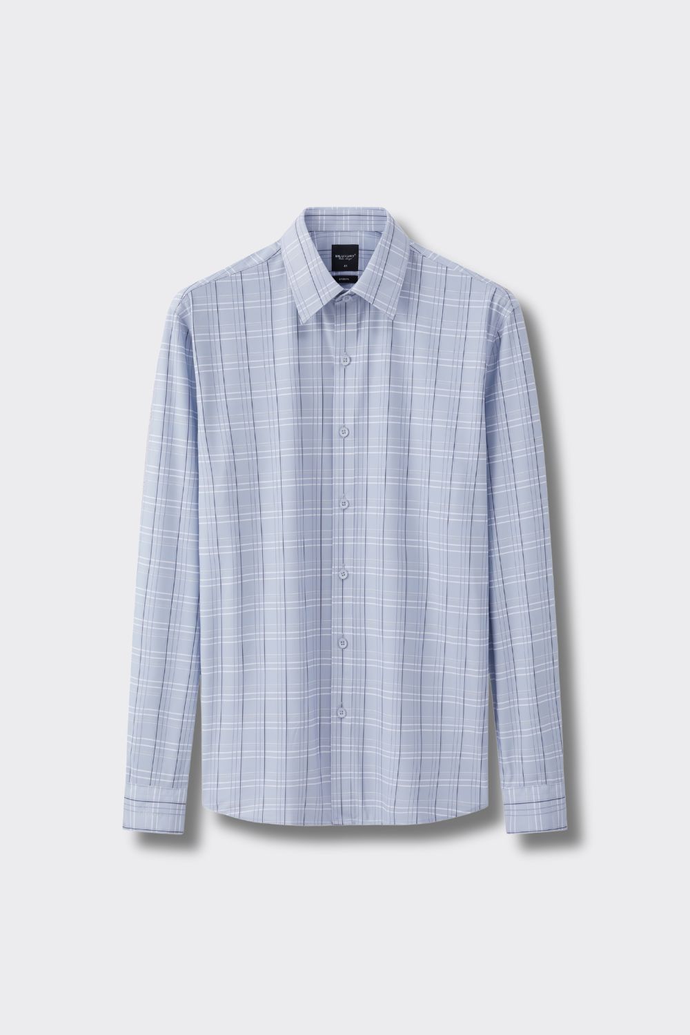Thiết kế: Tay dài, lá cổ nhọn, hoạ tiết caro kẻ mảnh được phối màu ghi xanh thanh lịch
