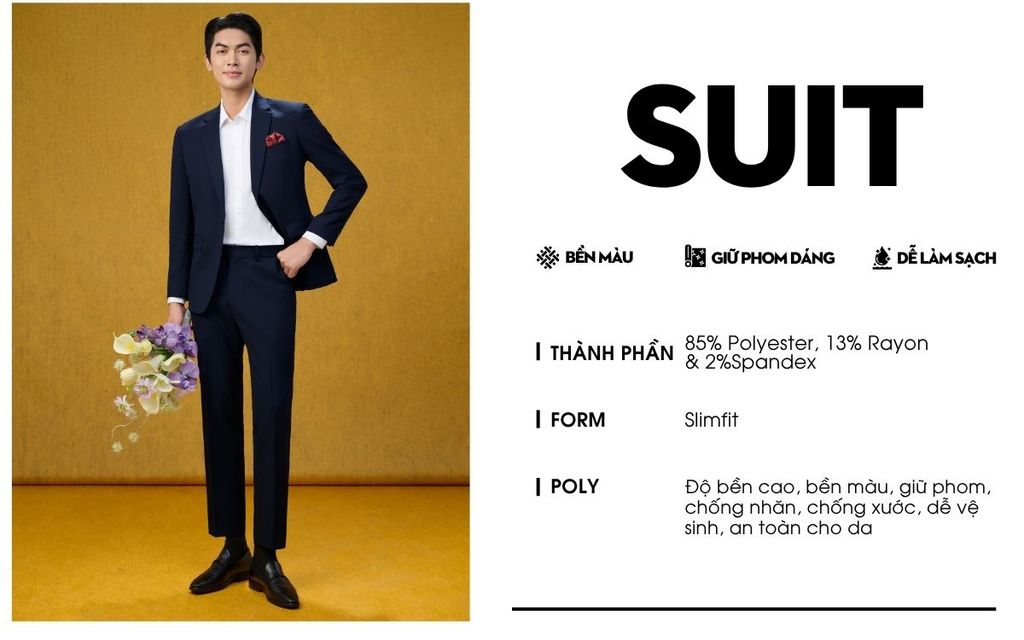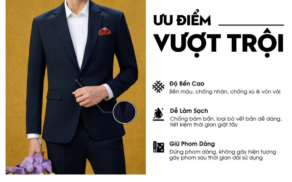 Ưu điểm: Bền màu, chống nhăn, thấm hút mồ hôi, giữ phom tốt
