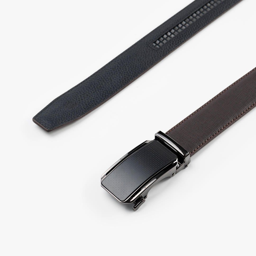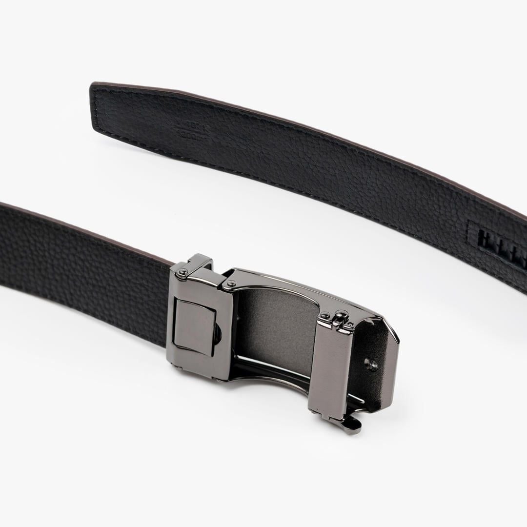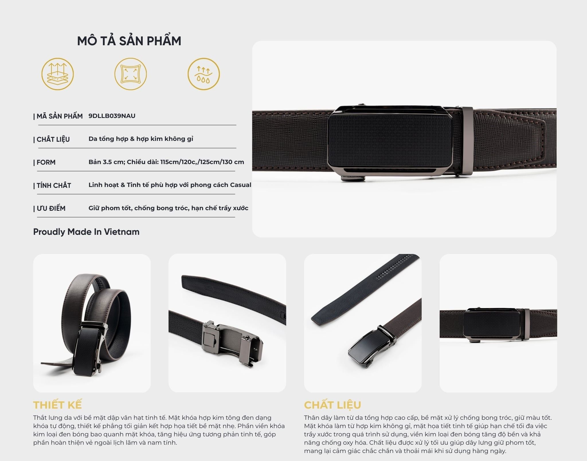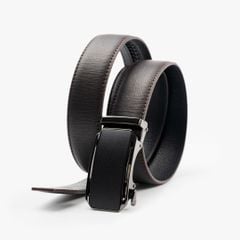 Thiết kế: Thắt lưng da với bề mặt dập vân hạt tinh tế. Mặt khóa hợp kim tông đen dạng khóa tự động, thiết kế phẳng tối giản kết hợp họa tiết bề mặt nhẹ. Phần viền khóa kim loại đen bóng bao quanh mặt khóa, tăng hiệu ứng tương phản tinh tế, góp phần hoàn thiện vẻ ngoài lịch lãm và nam tính.