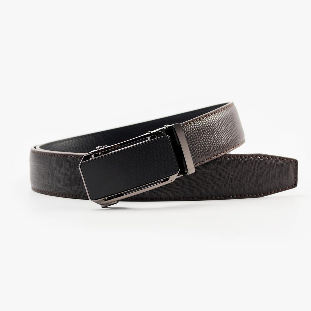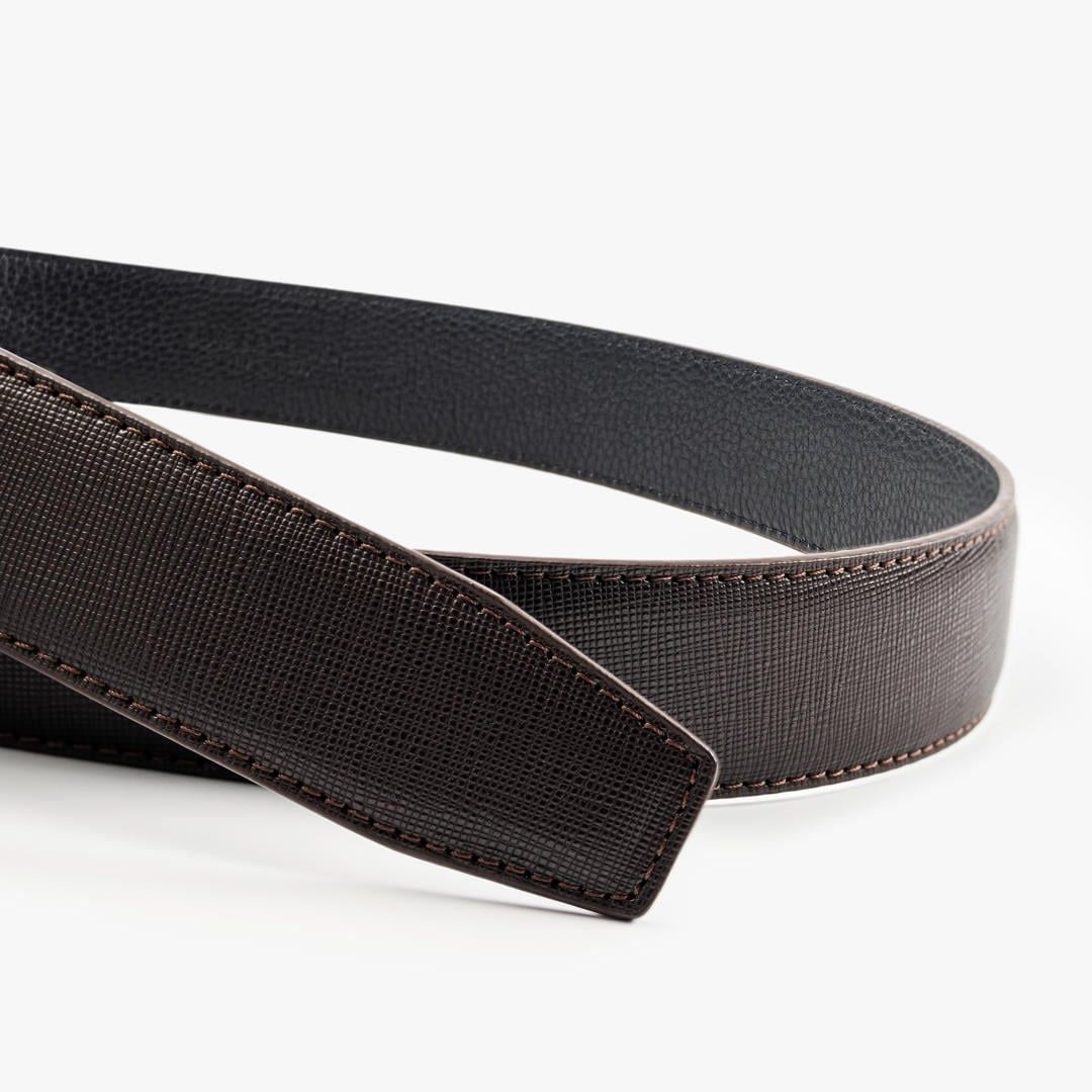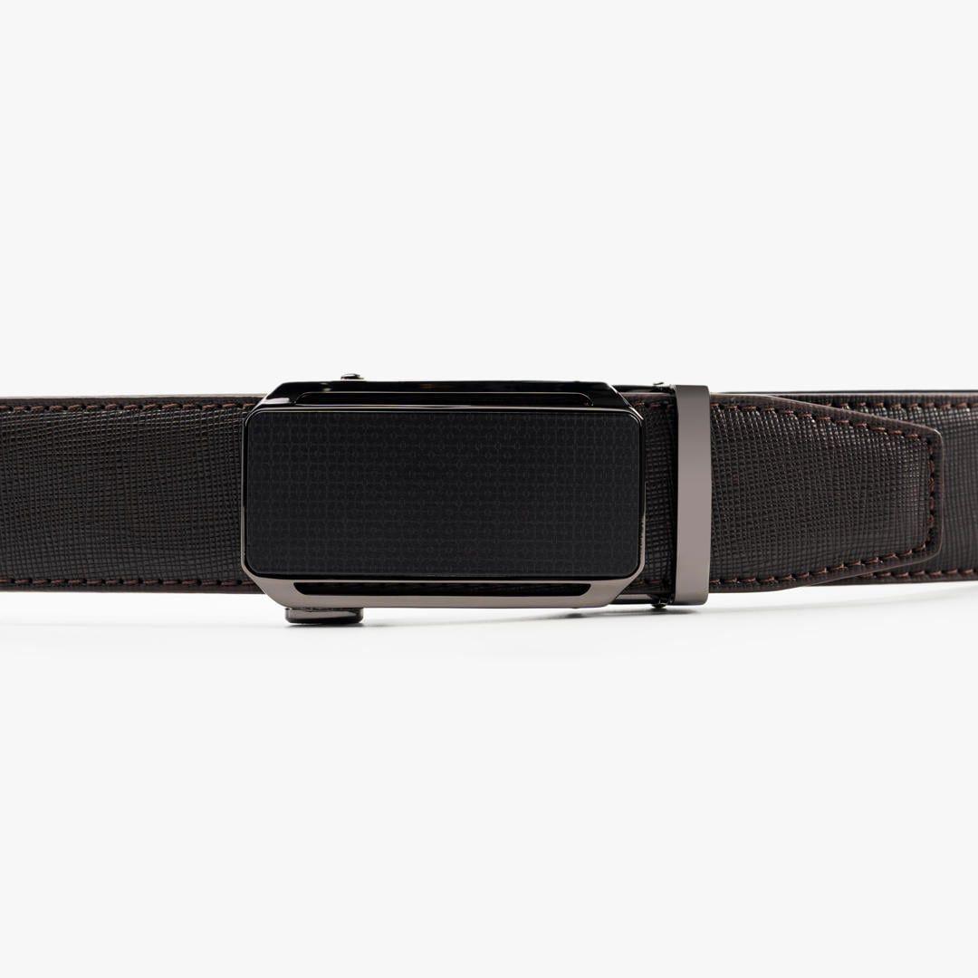 Thiết kế: Thắt lưng da với bề mặt dập vân hạt tinh tế. Mặt khóa hợp kim tông đen dạng khóa tự động, thiết kế phẳng tối giản kết hợp họa tiết bề mặt nhẹ. Phần viền khóa kim loại đen bóng bao quanh mặt khóa, tăng hiệu ứng tương phản tinh tế, góp phần hoàn thiện vẻ ngoài lịch lãm và nam tính.