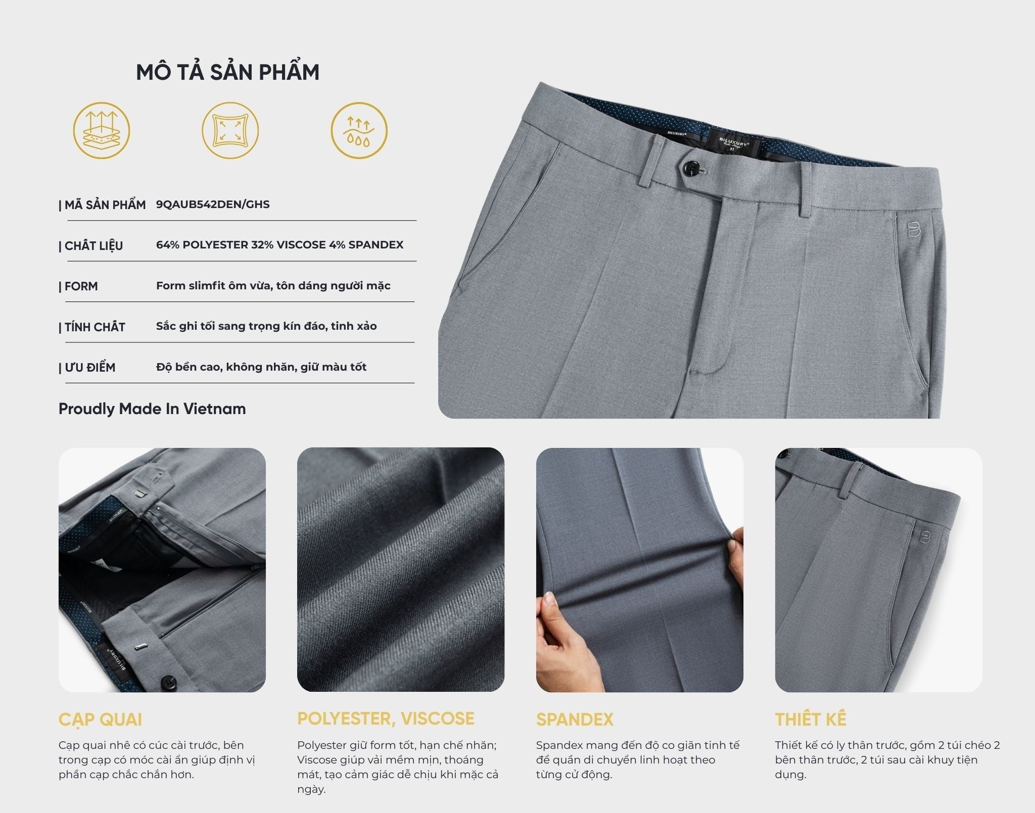 Thiết kế: Thiết kế có ly thân trước, gồm 2 túi chéo 2 bên thân trước, 2 túi sau cài khuy tiện dụng. Cạp quai nhê có cúc cài trước, bên trong cạp có móc cài ẩn giúp định vị phần cạp chắc chắn hơn.
