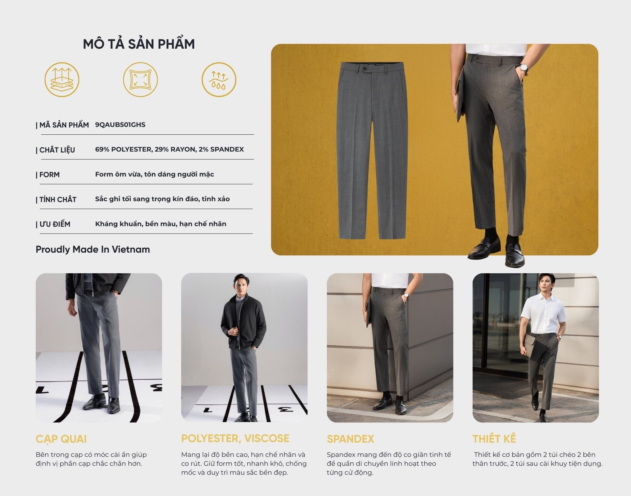 Quần Âu Ghi Xám Chống Nhăn, Co Giãn, Chống Bám Bẩn 9QAUB501GHS