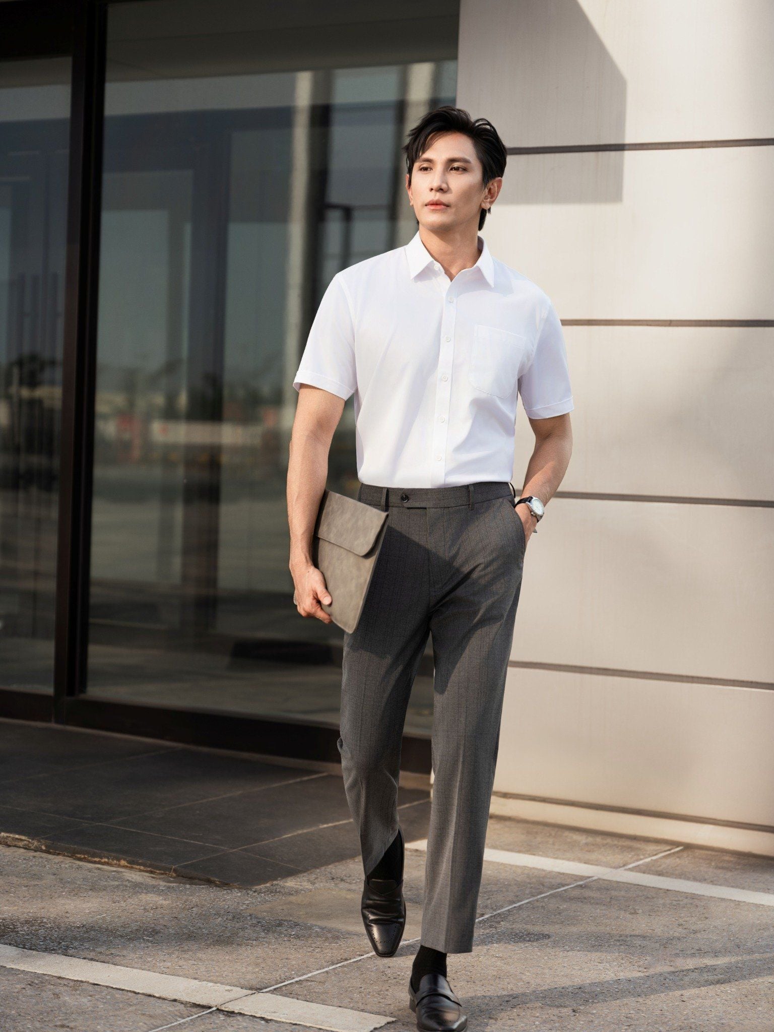 - Thiết kế cơ bản gồm 2 túi chéo 2 bên thân trước, 2 túi sau cài khuy tiện dụng