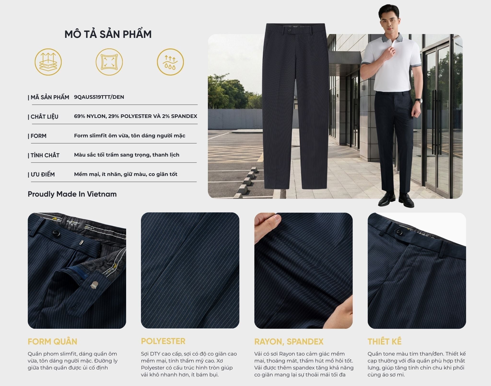 Thiết kế: Quần tone màu tím than/đen. Thiết kế cạp thường với đỉa quần phù hợp thắt lưng, giúp tăng tính chỉn chu khi phối cùng áo sơ mi.