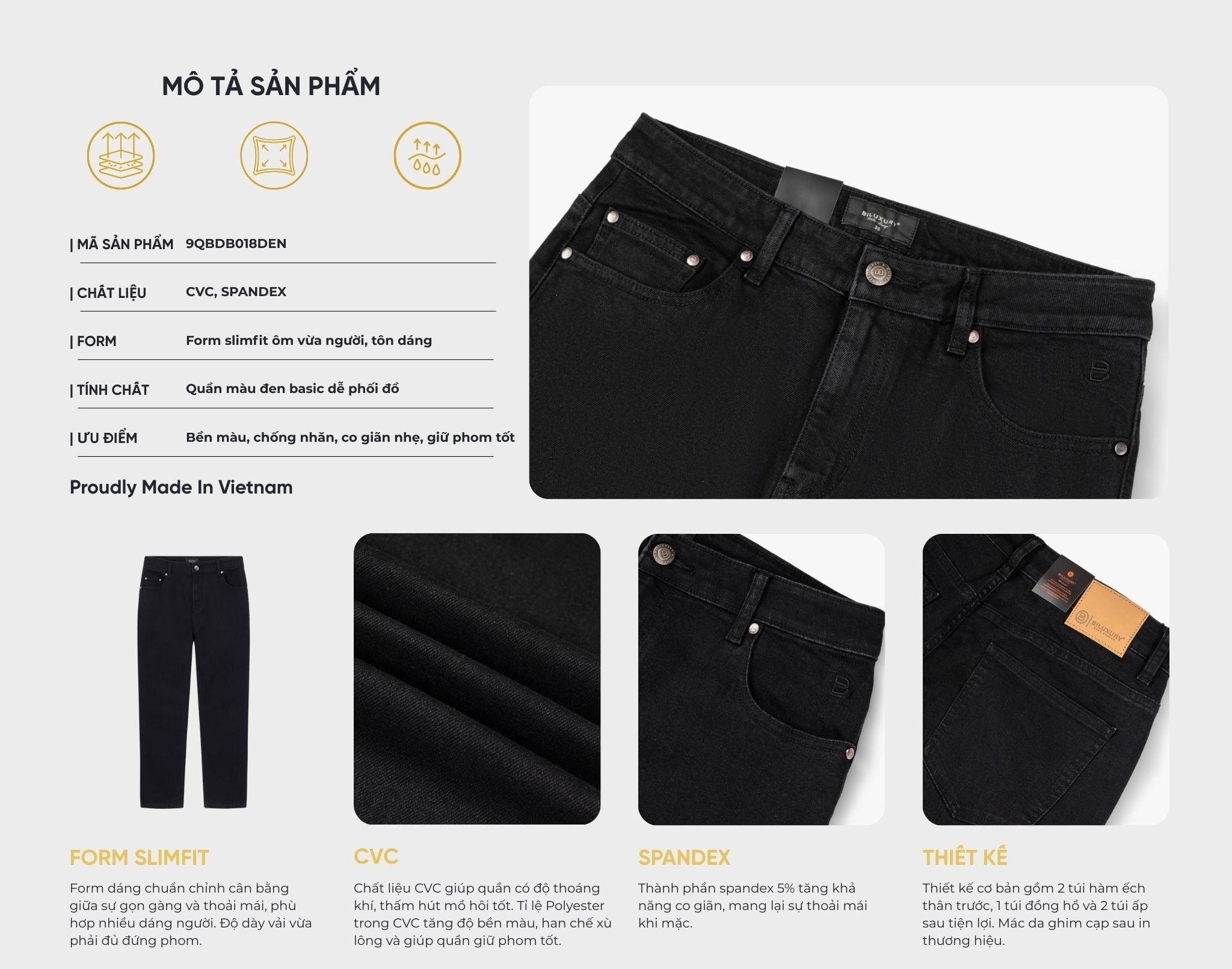 Thiết kế: Thiết kế cơ bản gồm 2 túi hàm ếch thân trước, 1 túi đồng hồ và 2 túi ấp sau tiện lợi. Mác da ghim cạp sau in thương hiệu.