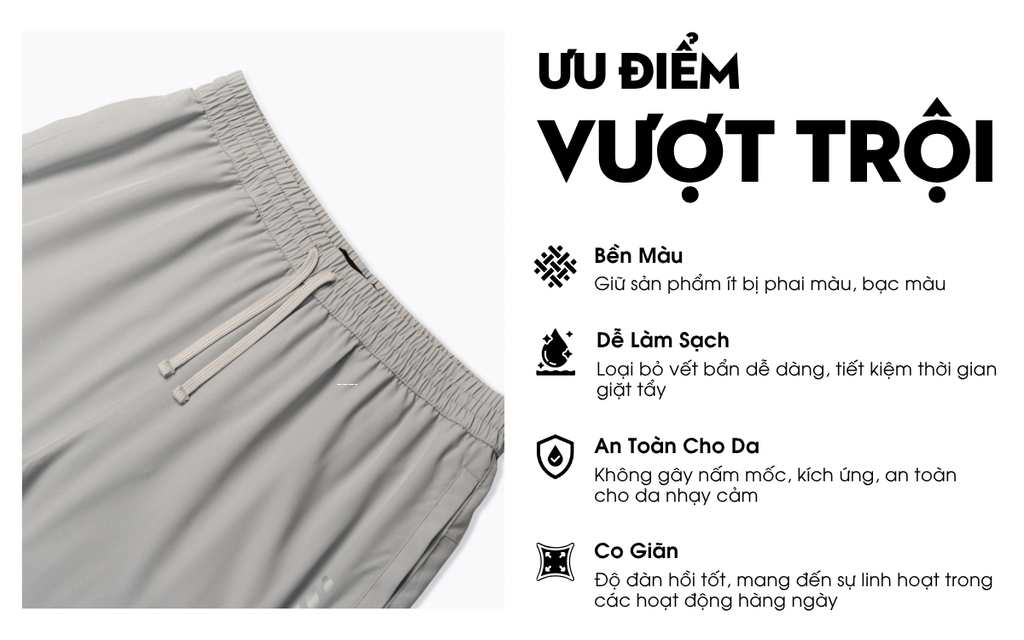 Ưu điểm: Mềm mại, co giãn tốt, nhanh khô, đứng form
